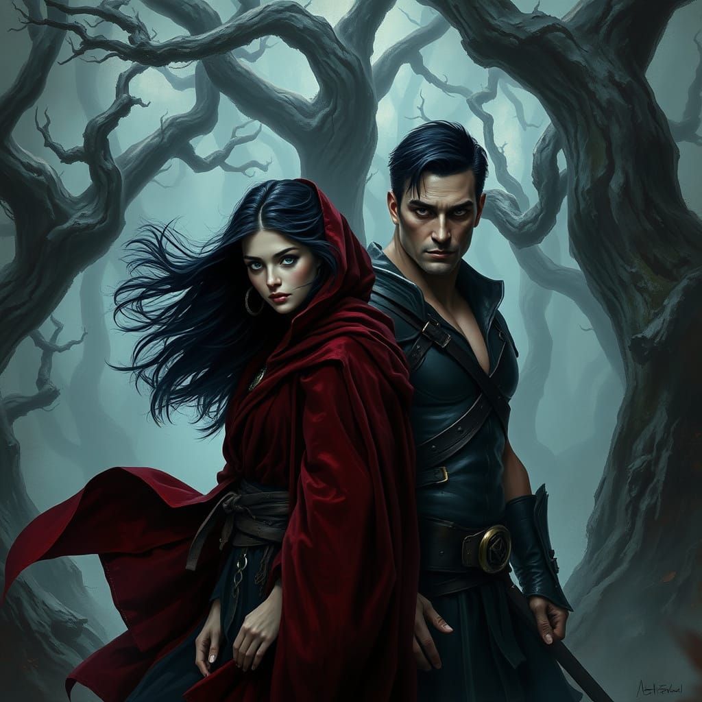 An AI-generated image depicting a mysterious woman with glowing eyes beside a warrior in ancient woods. The artwork blends dark fantasy realism with elegant, organic curves and expressive brushwork.