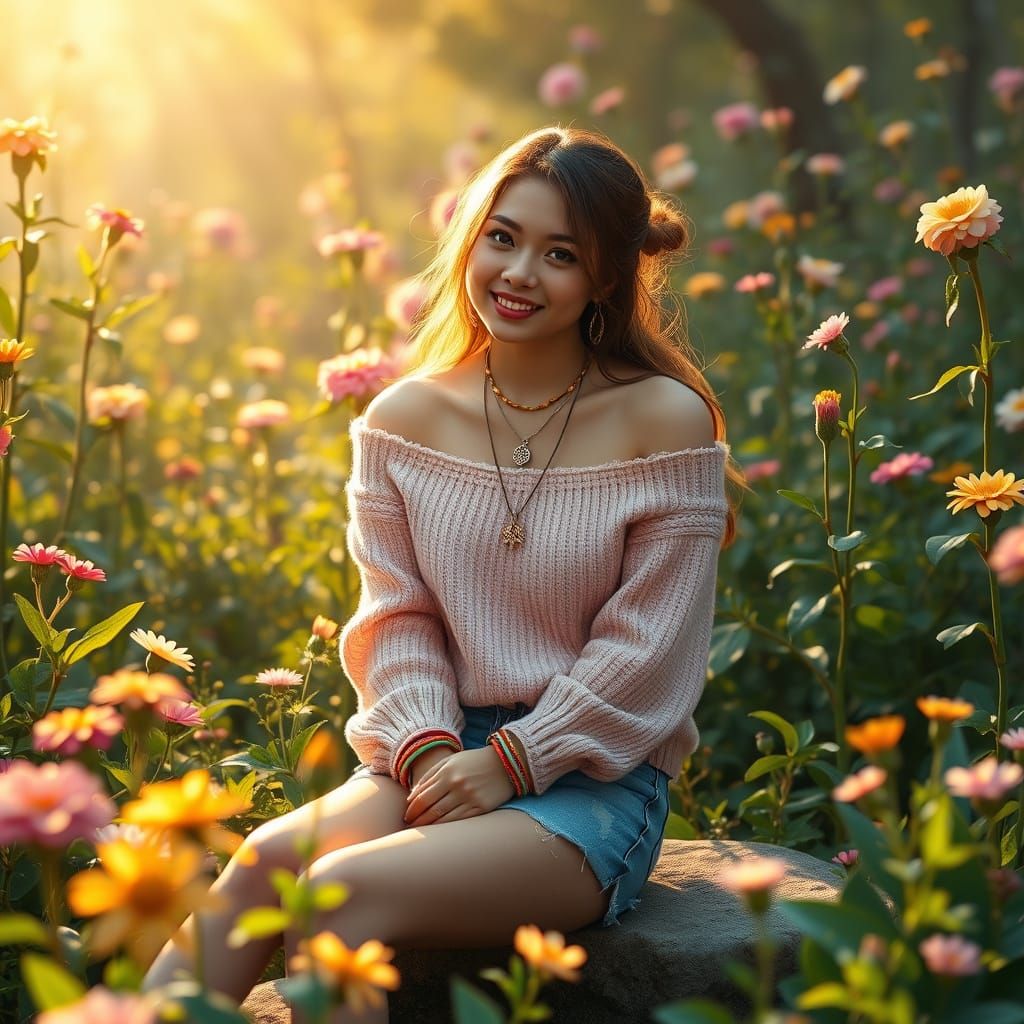 a whimsical young woman sitting on the ground in a lush, vibrant garden. She wears an off-the-shoulder patterned sweater in pastel colors and denim shorts, with multiple colorful bracelets and necklaces adorning her neck. Her long, flowing red hair is styled in loose waves, cascading down her shoulders. ...