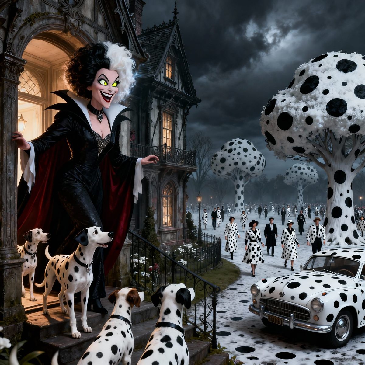 This photorealistic image shows Cruella de Vil exiting a gothic house with her dogs, observing a surreal world where everything is covered in dalmatian spots. The scene features dramatic, cinematic lighting.