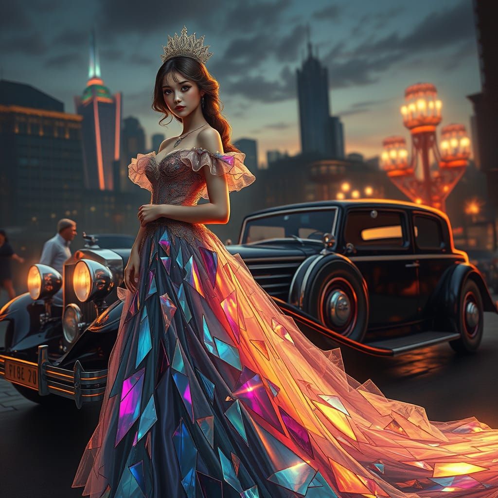 This image depicts a regal anime noblewoman in a vintage gown made of iridescent glass shards, standing by a 1930s car. It features a moody twilight cityscape with glitchcore elements, rendered in a dramatic oil painting style with cinematic lighting.
