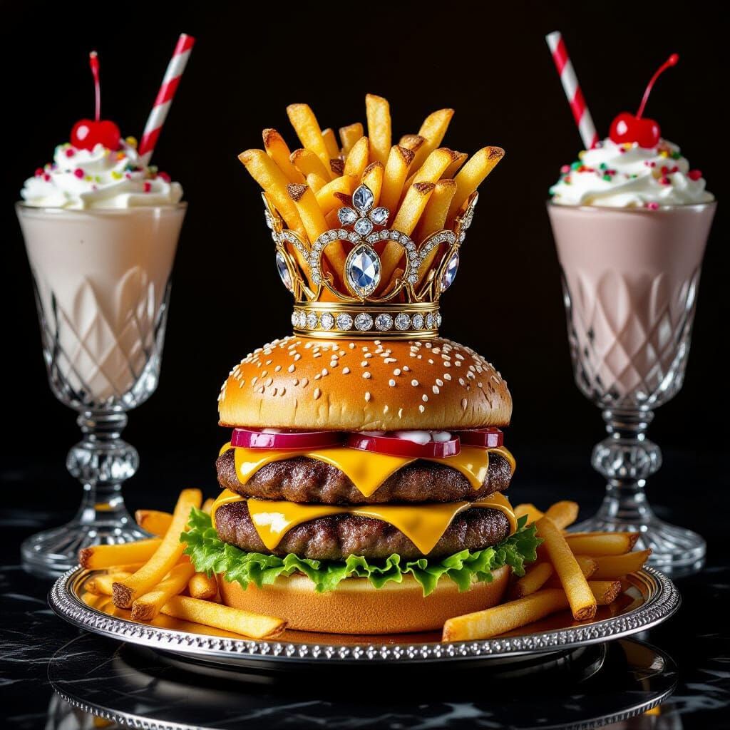 "Hyper-detailed luxury still life of a golden burger throne centerpiece, diamond fries on silver platters, crystal chalices overflowing with rich milkshake, shot in perfect studio lighting, 8K ultra-realistic, rich textures, food photography meets high fashion"