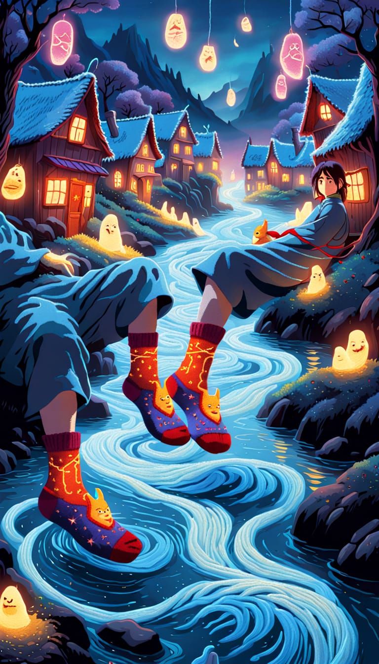 A surreal realm where socks have evolved into sentient beings โ towering sock castles, rivers of lint, sock-knights riding mismatched slippers, glowing embroidery runes stitched into their woolly forms, cotton clouds shaped like laundry baskets, twilight skies, magical thread loops drifting in the air โ whimsical, detailed, dreamlike fantasy, Studio Ghibli style, intricate textures, soft lighting, enchanted atmosphere