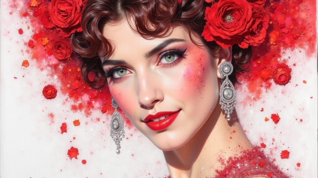 A vibrant portrait of a regal London princess. The artwork evokes emotion through vivid scarlet and silver hues, reminiscent of a mixed-media sketch with oil and dry brush techniques.