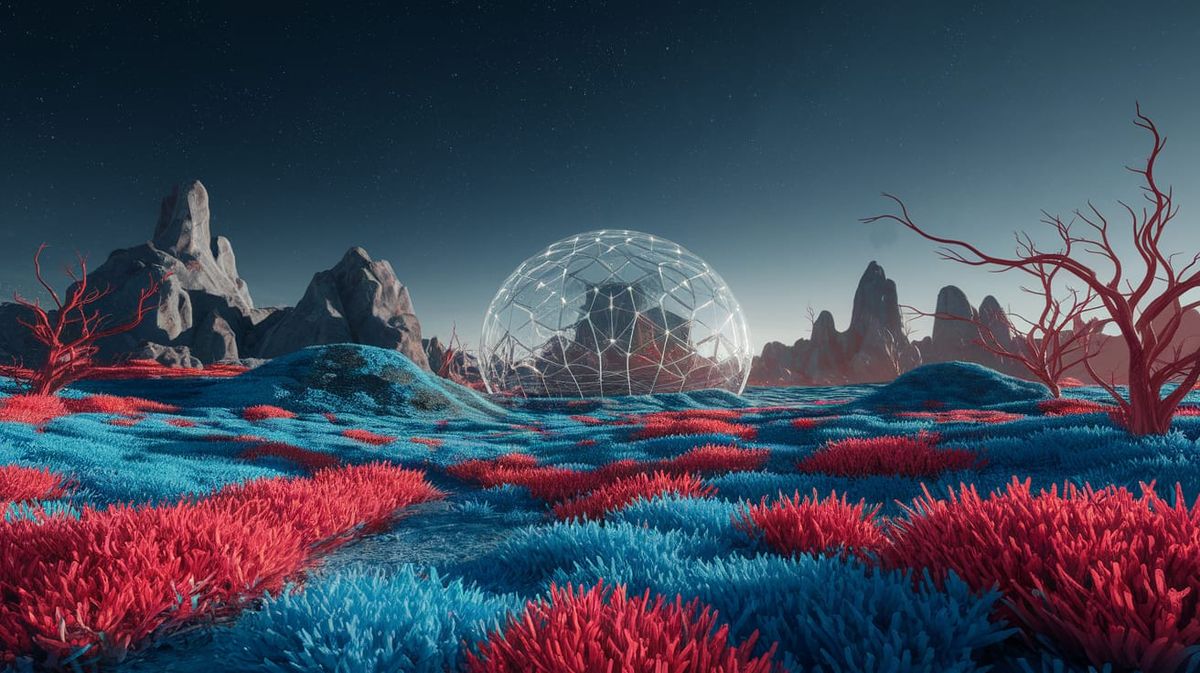 This image shows a striking alien landscape featuring vibrant blue and red flora under a dark sky. A unique, glass-covered space station dominates the view, set against a bioluminescent forest backdrop.