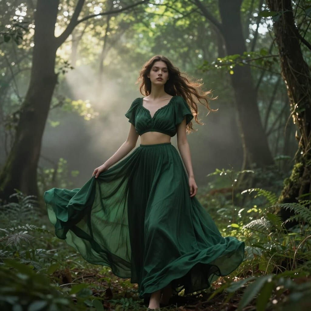A woman in a dark green dress stands in a sun-dappled forest, mist swirling around her. Inspired by Pre-Raphaelite art, the image evokes natural beauty and romanticism with rich, vibrant colors.