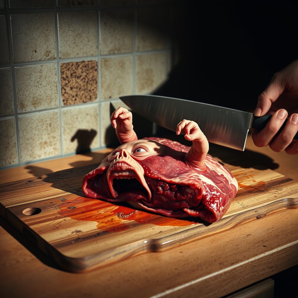 A disturbing image showing raw meat on a cutting board, grotesquely shaped like a terrified human face. A large knife is raised above, with the scene lit dramatically to enhance the horror.
