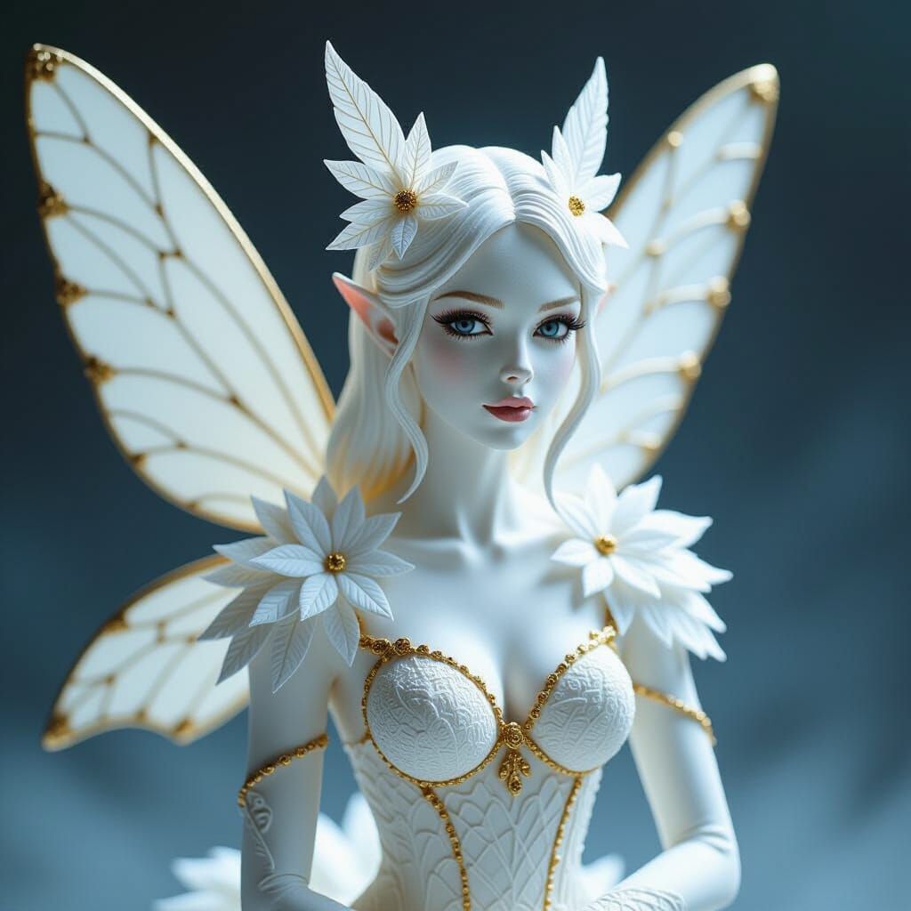 A striking picture of a fairy made of white clay fragments connected by gold. The image is rendered with sharp focus and hyperrealistic details in a cinematic style with high contrast.
