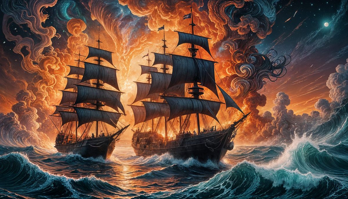 This image shows a dramatic holographic illustration of a naval battle on a sea of flames, with cosmic elements and mixed media techniques used to create a striking and otherworldly effect.
