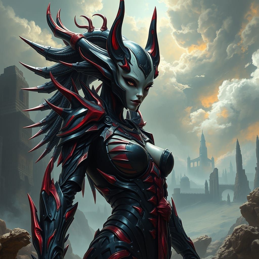 This image depicts a powerful, otherworldly female warrior deity, clad in a suit of black and crimson armor with jagged spikes, set against a backdrop of ancient ruins and ominous clouds, evoking a sense of mystical energy and fierce power, in a style blending digital landscapes and dark, biomechanical v...