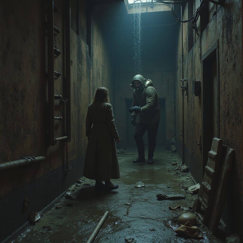 A haunting image of a woman in a long coat being approached by an old-fashioned diver in the lower decks of a rusty ship. The picture evokes a Gustave Doré-inspired atmosphere with dramatic lighting.