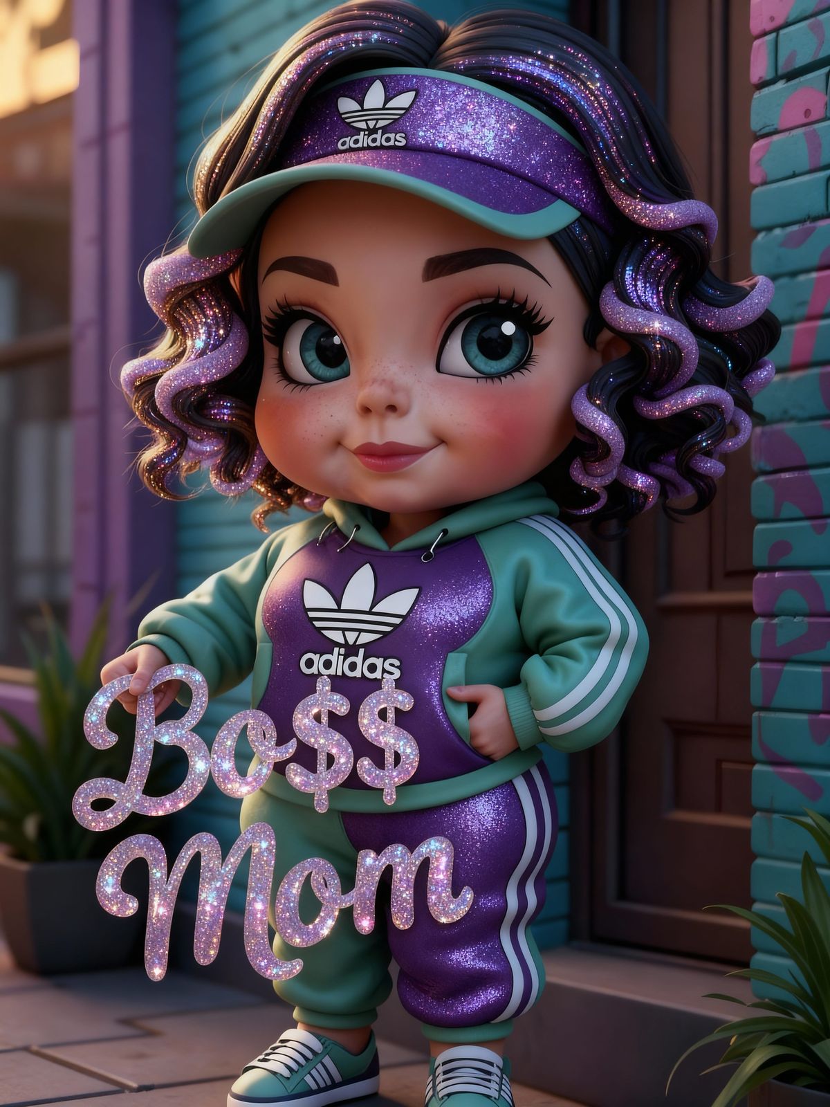This 3D render features a chubby chibi woman with freckles and curly hair, holding iridescent glitter text that reads "Bo$$ Mom" against a colorful graffiti wall.