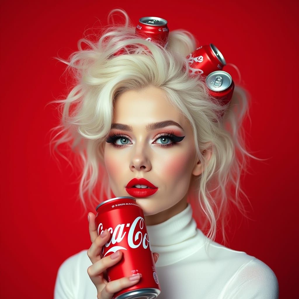 This image showcases a young woman with voluminous white hair, bold makeup, and a striking red background, creating a visually striking scene reminiscent of high-fashion photography.