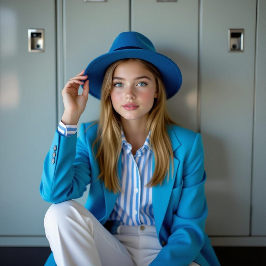 This image shows a 15-year-old French girl sitting on a bench by lockers. She's wearing a blue shirt, white trousers, a blue blazer and Converse shoes. The photo is taken from above with soft, natural light, in a contemporary style.