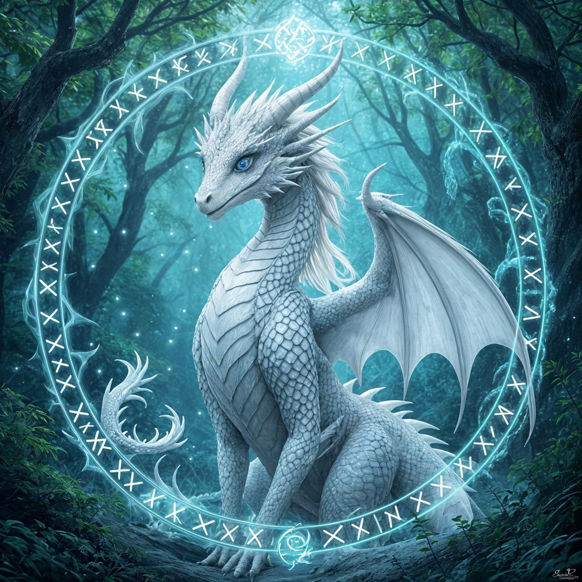 This image shows a slender white dragon in a magical forest. Glowing runes surround the beautiful, feminine dragon with silver wings and ocean blue eyes.