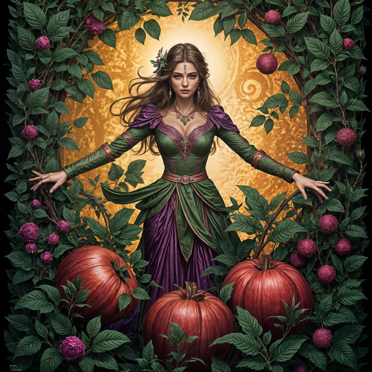 This image depicts a stunning princess emerging from a pomegranate, rendered in photorealistic detail with vibrant green and magenta hues, showcasing advanced volumetric lighting techniques.