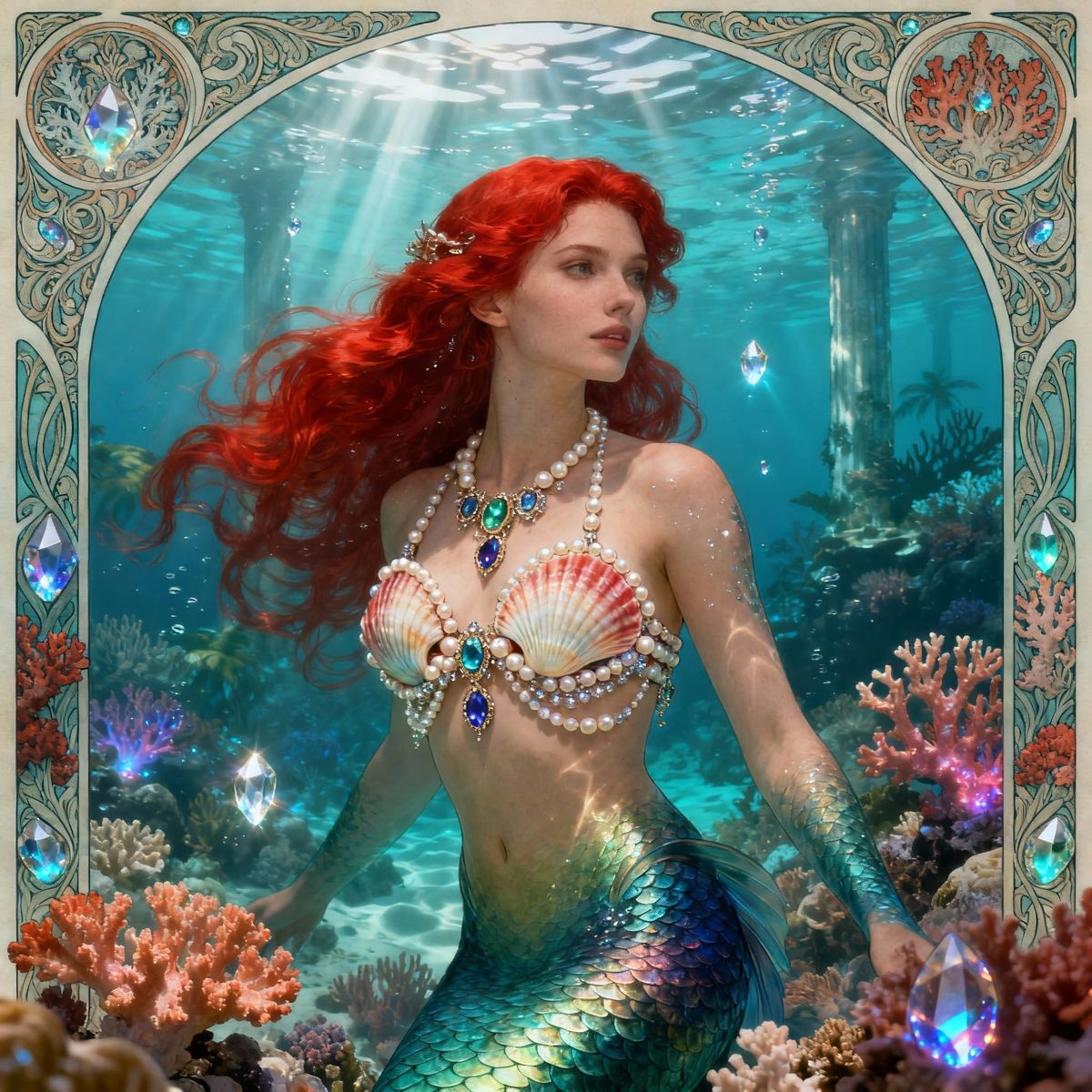 This image showcases a redheaded mermaid with pearl adornments in a tropical sea, detailed with vibrant coral and clear water, rendered with intricate lines and dynamic lighting.
