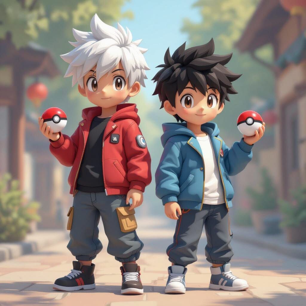 This image shows two boys in a dynamic pose, rendered as highly detailed 3D anime art. They are holding pokeballs in a vibrant, colorful style reminiscent of Genshin Impact.