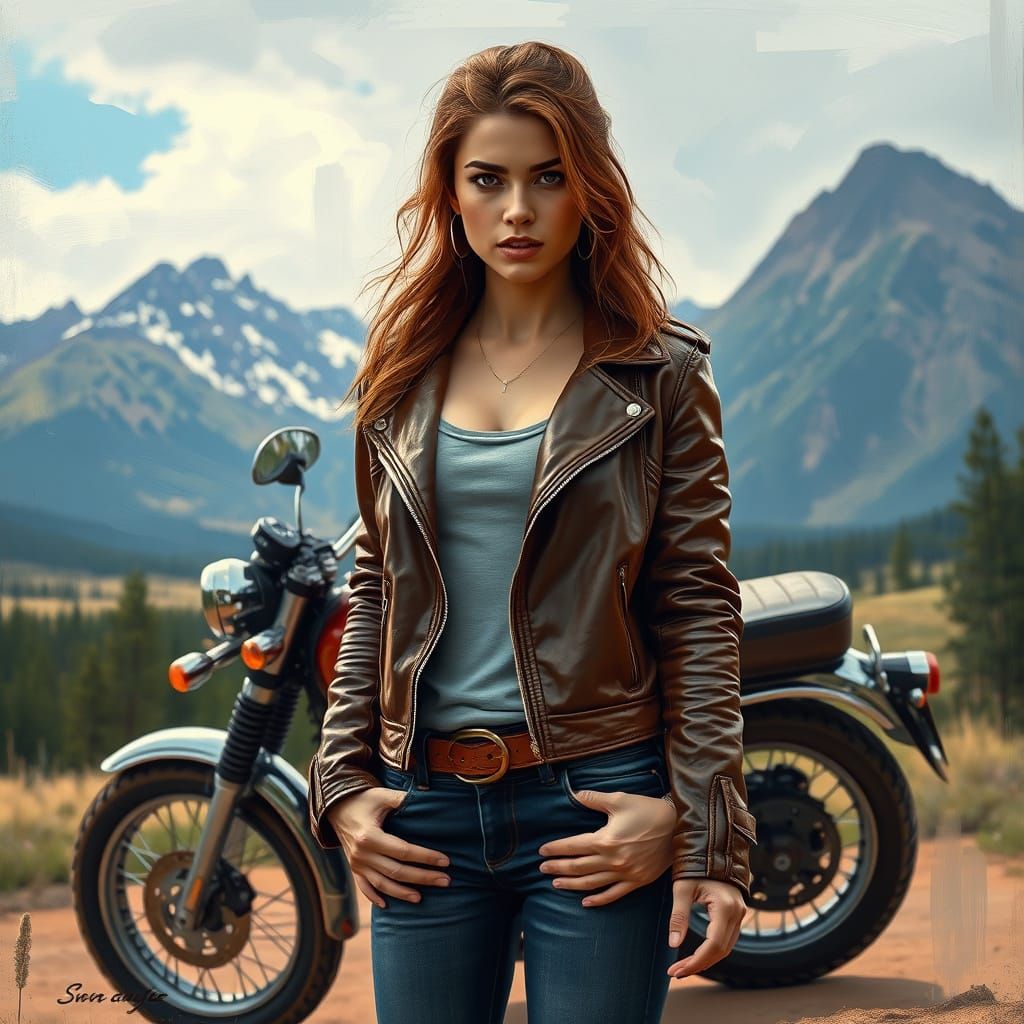 This image depicts a young woman in a leather jacket and jeans, standing confidently in front of a vintage motorcycle, set against a stunning Colorado landscape with the majestic Rocky Mountains in the background. The artwork blends the expressive brushstrokes of a contemporary style with the atmospheric...
