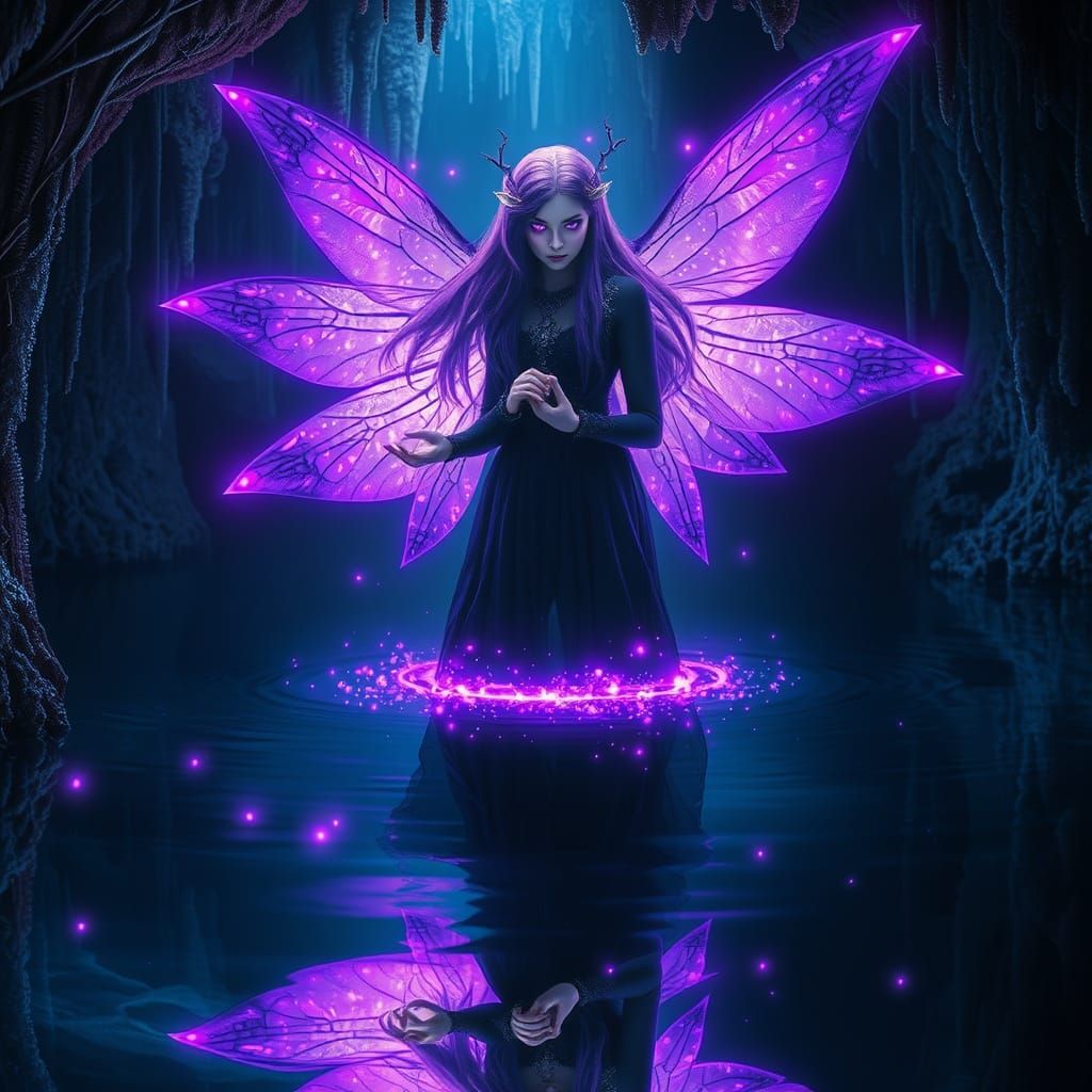 This image depicts a mystical dark fairy surrounded by an aura of energy, standing in a cave amidst crystal clear water and stalactites. The fairy's long, flowing purple hair and translucent wings shimmer with a mesmerizing electronic circuitry pattern, while her hands glow with a vibrant purple light, c...