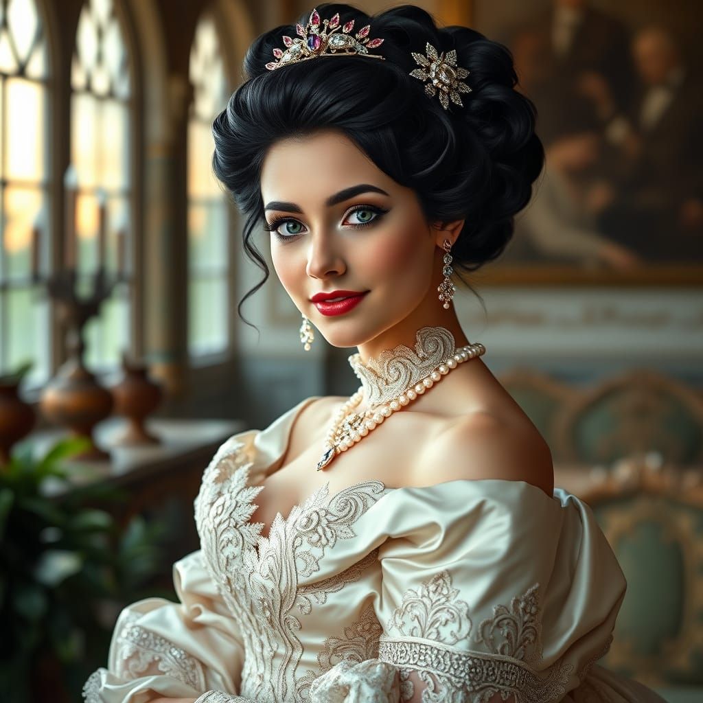 This image shows a beautiful woman in a stunning, high-necked ball gown, adorned with lace, pearls, and gemstones, surrounded by opulent furnishings and lush greenery, evoking the romanticism of John William Waterhouse and Gustav Klimt