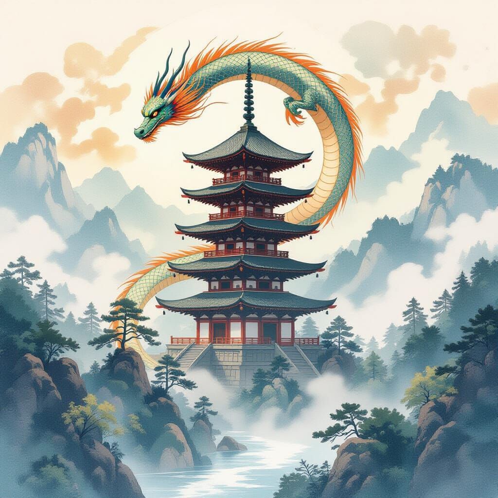 This image shows a dragon in flight around a pagoda, set against misty mountains and forests. The artwork evokes traditional Japanese prints, with shimmering scales and delicate watercolor textures.
