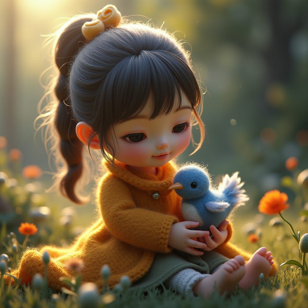 This image shows a felt character holding a small bird. The character is wearing detailed clothing, set in a serene scene. The artwork is in a vibrant 3D anime style with ultra-fine textures.