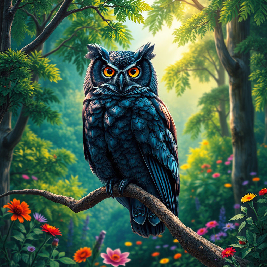 A stunning image of a black owl with iridescent feathers sitting on a sunlit branch. The owl is set against a colorful, lush forest backdrop in a painterly style.
