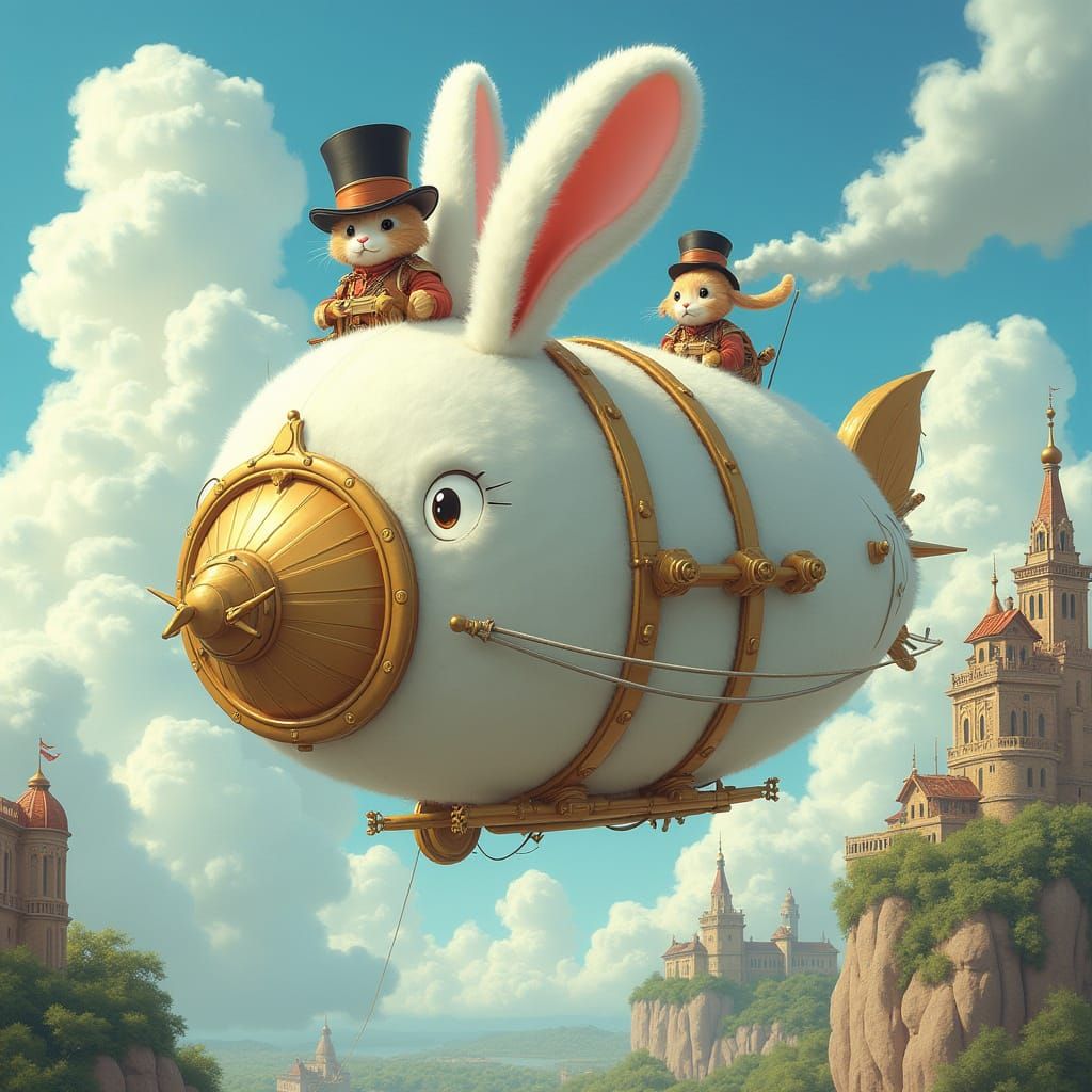 This image depicts a fantastical airship shaped like a giant, fluffy bunny, soaring through a vibrant, cotton candy sky filled with floating islands, intricate clockwork mechanisms, and lush Victorian-era architecture.