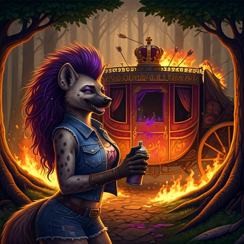 This image captures a stunning, photorealistic portrait of a feminine anthropomorphic hyena with purple hair, laughing with punk attitude, surrounded by flames and medieval chaos in Sherwood Forest.