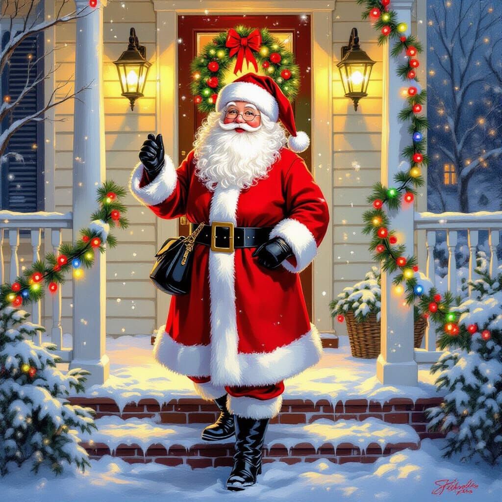 This image shows a festive Santa figure on a snowy porch amidst twinkling lights. The artwork evokes a warm glow and fantastical realism, with vibrant colors typical of pop surrealism.