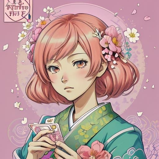 This image shows a girl with glasses holding trading cards, encircled by flowers. The digital art features soft focus, a pastel color scheme, intricate details and stylized lines, in an anime aesthetic.