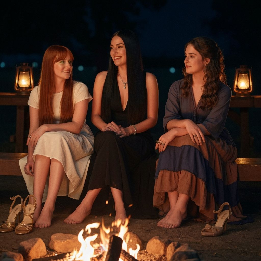 This image shows three young women relaxing by a bonfire at a rural party in Argentina. The warm, intimate atmosphere is captured with photorealistic detail and cinematic tones, reminiscent of a vintage photograph.