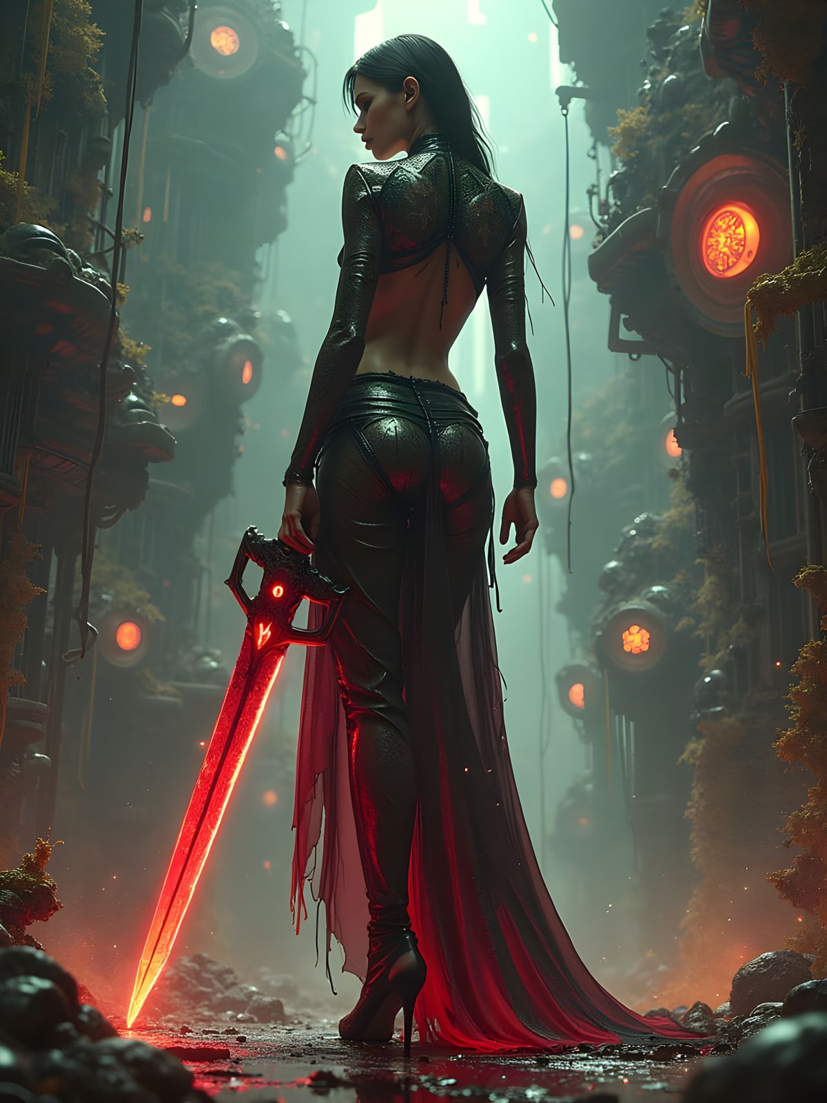 A hyper-realistic image of a woman in a daring cubist outfit with metallic shards and sheer panels, holding a glowing sword. She stands before a vast, detailed biomechanical city in a dystopian cathedral of machinery.