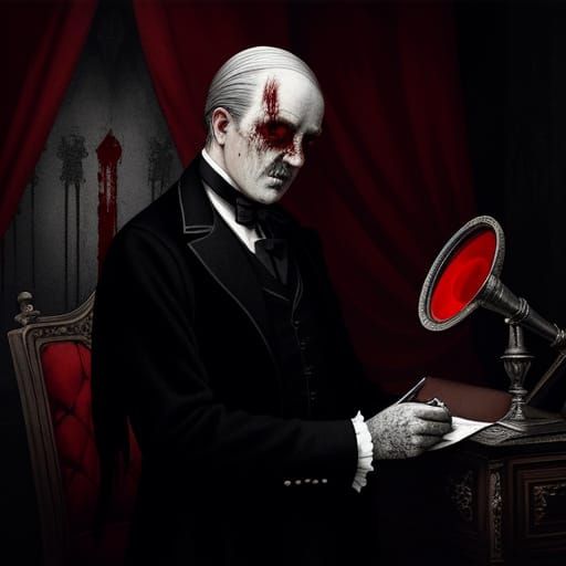 This image shows a gothic illustration of a detective inspecting bloody footprints in an old mansion. The scene, reminiscent of 1800s mysteries, features dark red accents contrasting against grey tones in the style of Edward Gorey.