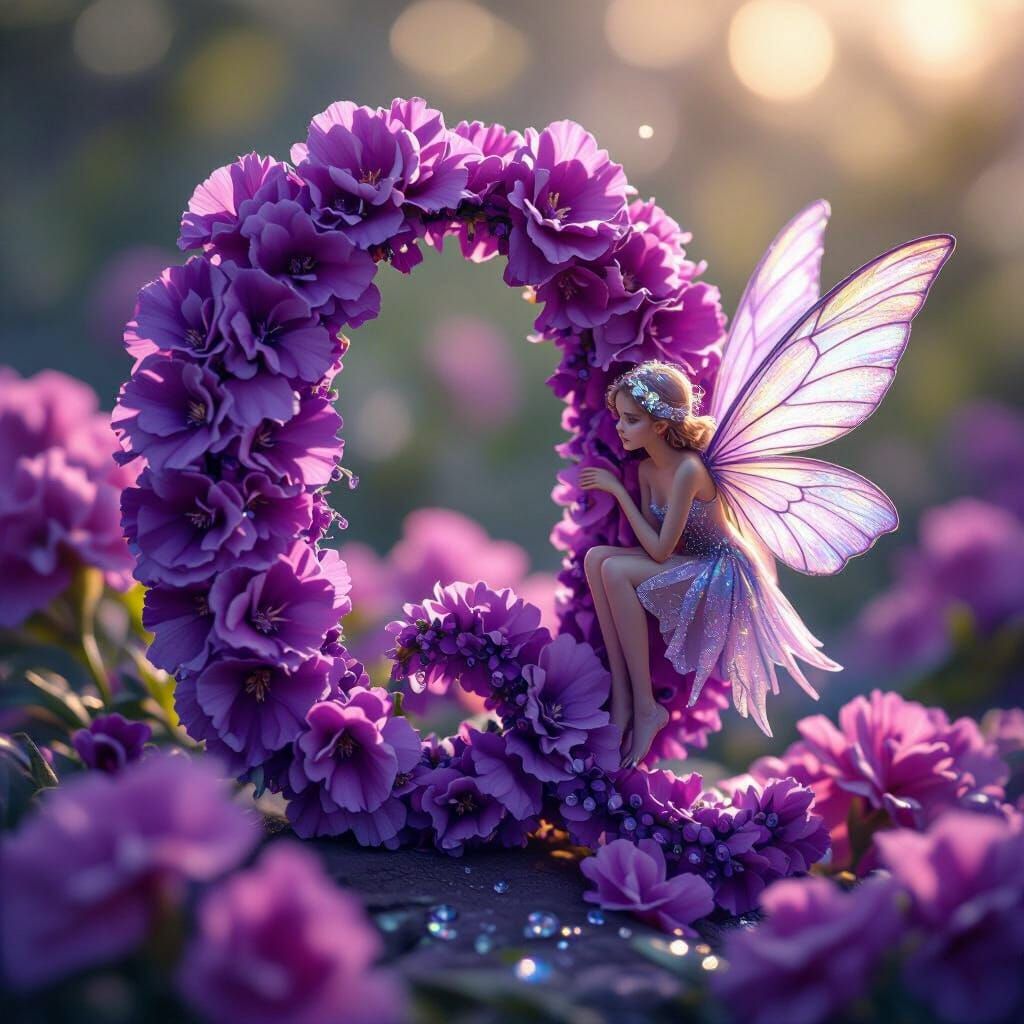 A photorealistic macro shot of a purple carnation letter Q with a fairy adorned in dewdrop jewels. Features diffused sunlight and shallow depth of field, in a luminous fantasy art style.
