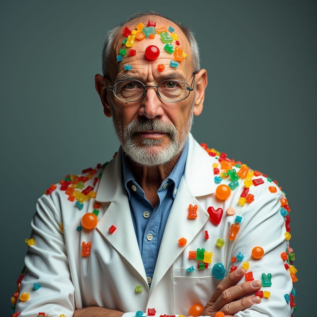 This image captures a doctor in a striking white lab coat, adorned with colorful candy pieces, gummy bears, and lollipops, evoking a sense of whimsy and contrast in a photorealistic, high-definition portrait.