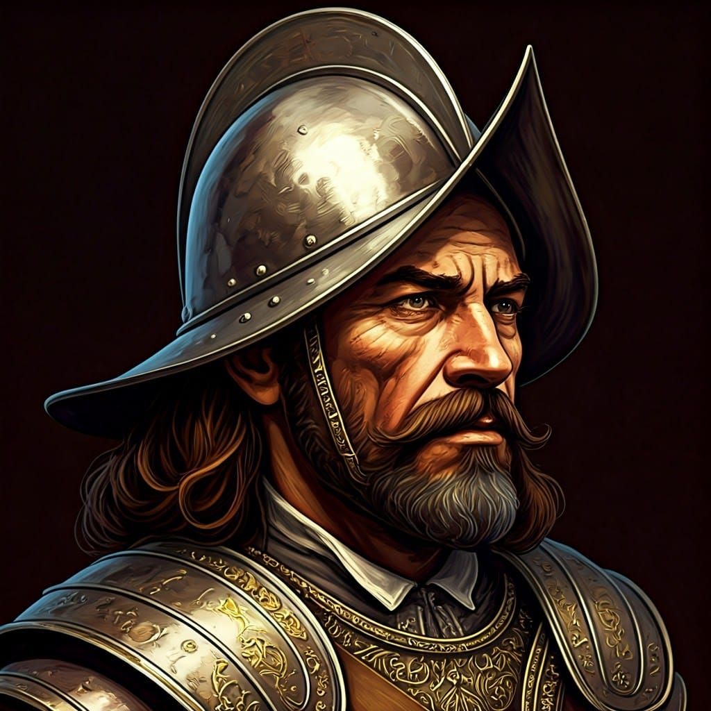 This image is a detailed depiction of a conquistador soldier, showcasing intricate gold and silver ornamentation on his helmet. Created in a style reminiscent of comic book art, with smooth lines and precise detail.