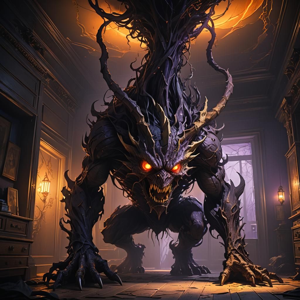 A dark fantasy creature looms in a bedroom corner, its sinister orange eyes glowing in the dim light. The image features hyperdetailed textures, dynamic lighting, and an Art Nouveau-inspired glow.