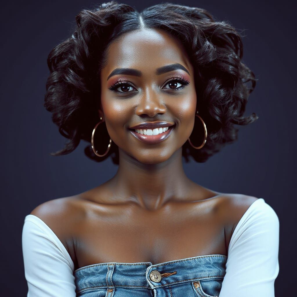 This image features a stunning, 90s-inspired portrait of a beautiful woman with glossy skin, exaggerated lips, and puffy hair. She's dressed in a white crop top and denim blue jeans, set against a soft, sparkling background.