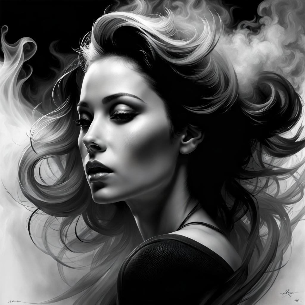 This image shows a black and white portrait of an attractive French woman with delicate features. She is exhaling smoke in a hazy, splash art style.