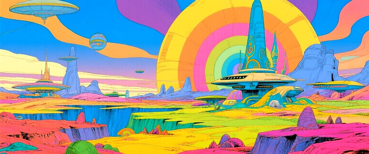 A vibrant illustration of a vast, otherworldly landscape. The image features highly saturated colors and a surreal, retro science fiction aesthetic reminiscent of Moebius's iconic style.