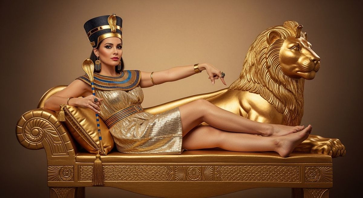 This image shows a beautiful Egyptian queen in a golden toga lounging on a lion-shaped chaise longue. The photograph features a shallow depth of field, bokeh, and natural lighting.