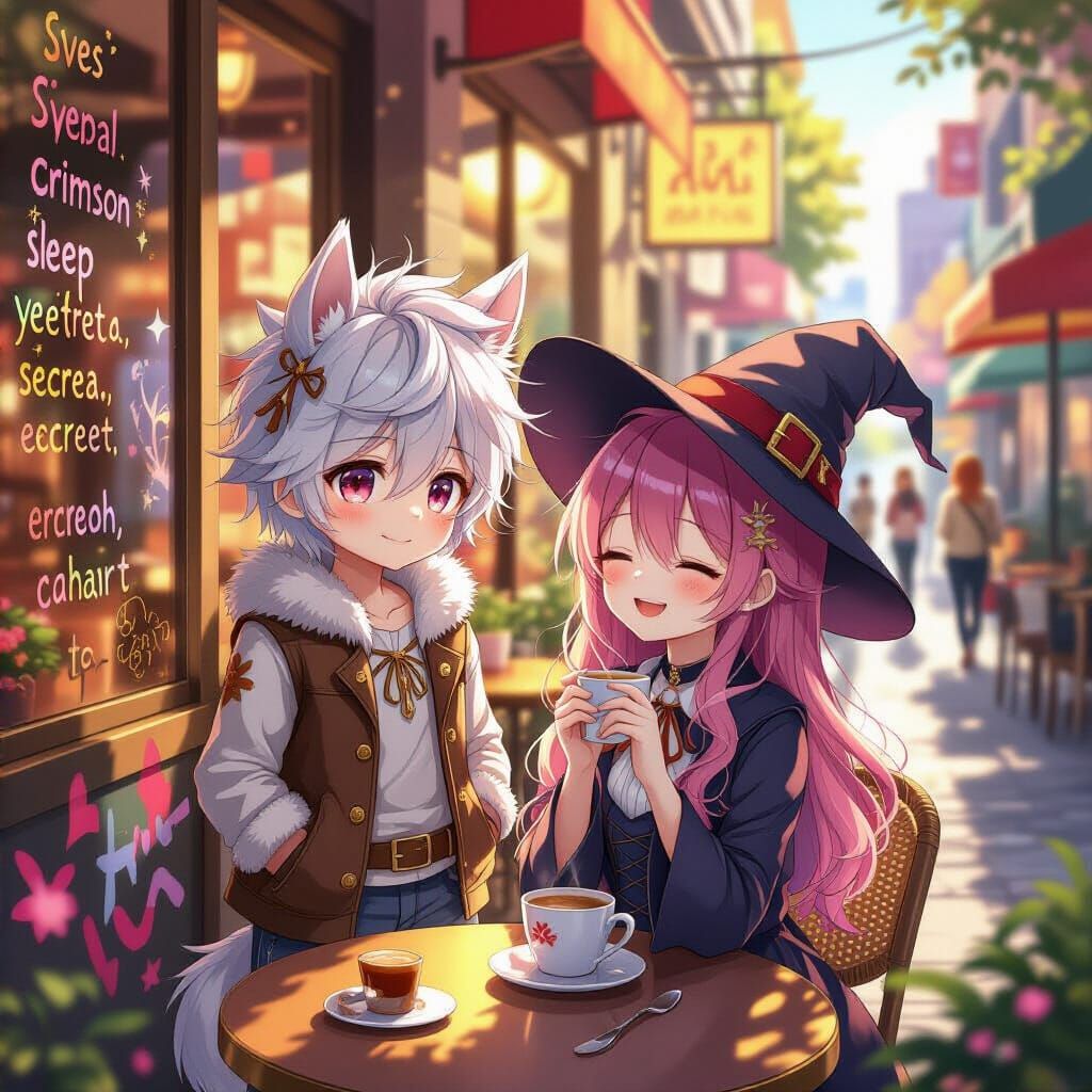 This image shows a cute anime boy, half-human and half-horse, with furry details, standing with a smiling girl in a witch's hat. They are in a sunny cityscape with graffiti art, rendered in a vibrant street art style with melting textures and high contrast colors.