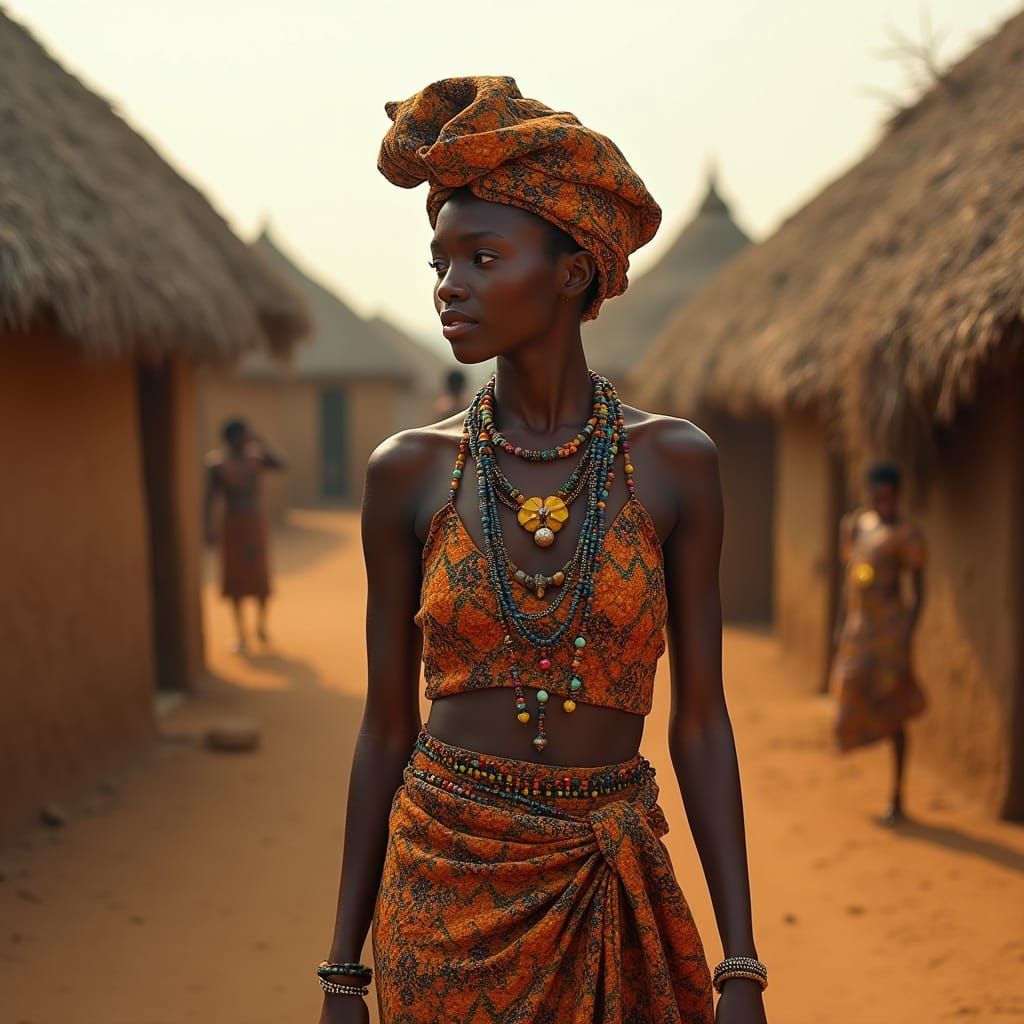 This image shows a Nigerian princess walking through a rural village, surrounded by thatched huts, in traditional attire adorned with vibrant beads, evoking a sense of African culture and warmth.