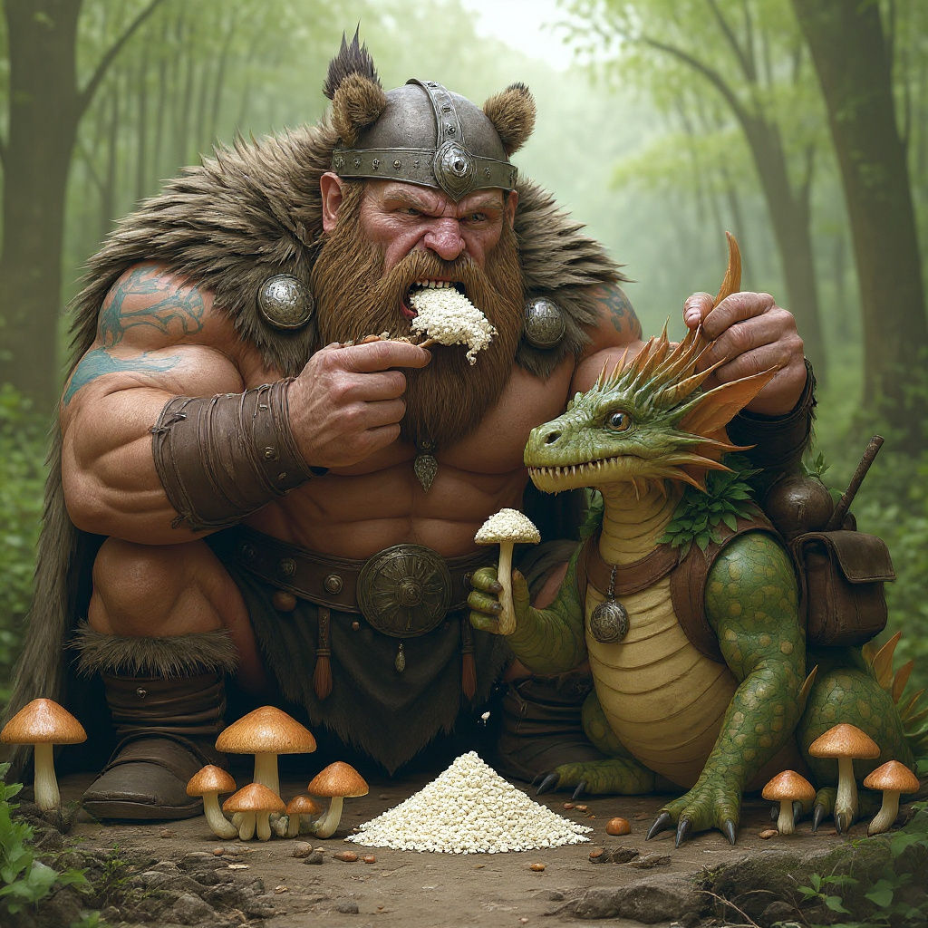 A digital painting shows a huge Viking with a pet dragon feasting on mushrooms. The artwork features earthy tones, intricate textures and a blend of fantasy and realism.