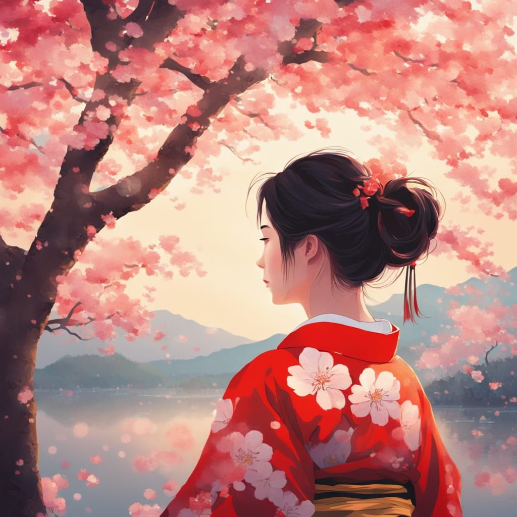 This image shows a woman in a red kimono beneath a cherry blossom tree at sunset. The picture evokes traditional Japanese art, rendered with impressionistic brushstrokes and soft, dreamy colors.
