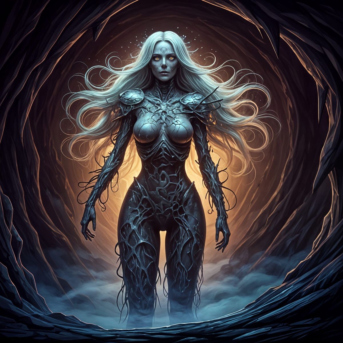 A surreal dark fantasy illustration of an undead female miner partially consumed by living mithril. Glowing silver-blue strands pulse beneath her decayed skin, with organic mithril growths covering parts of her body.