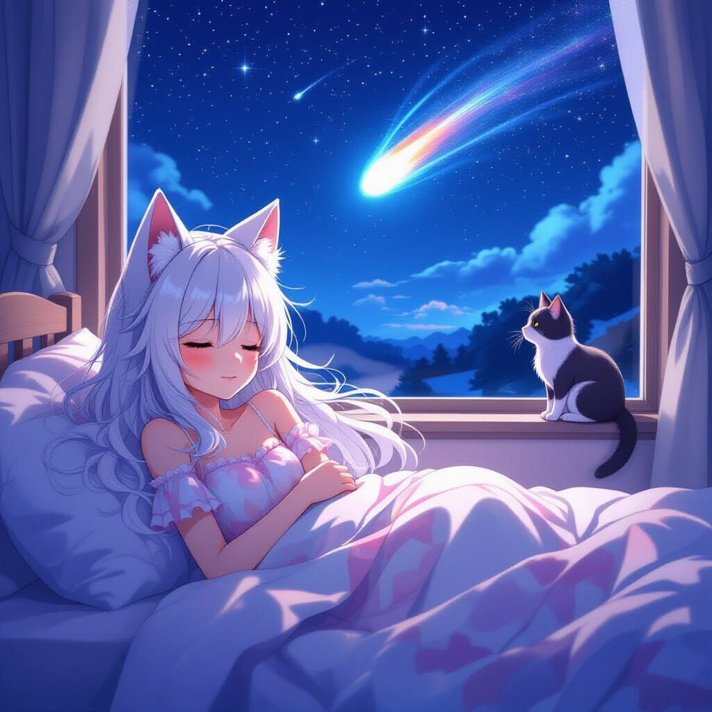 This image shows a girl with wolf ears sleeping soundly in her bed. A cat watches a comet fly by from the window on a summer night, rendered in a detailed anime style.