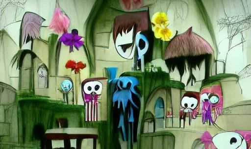 This image depicts Foster's Home for Imaginary Friends in a cartoon style. It features horror elements, colorful flowers, and a cemetery, reminiscent of the Day of the Dead aesthetic.