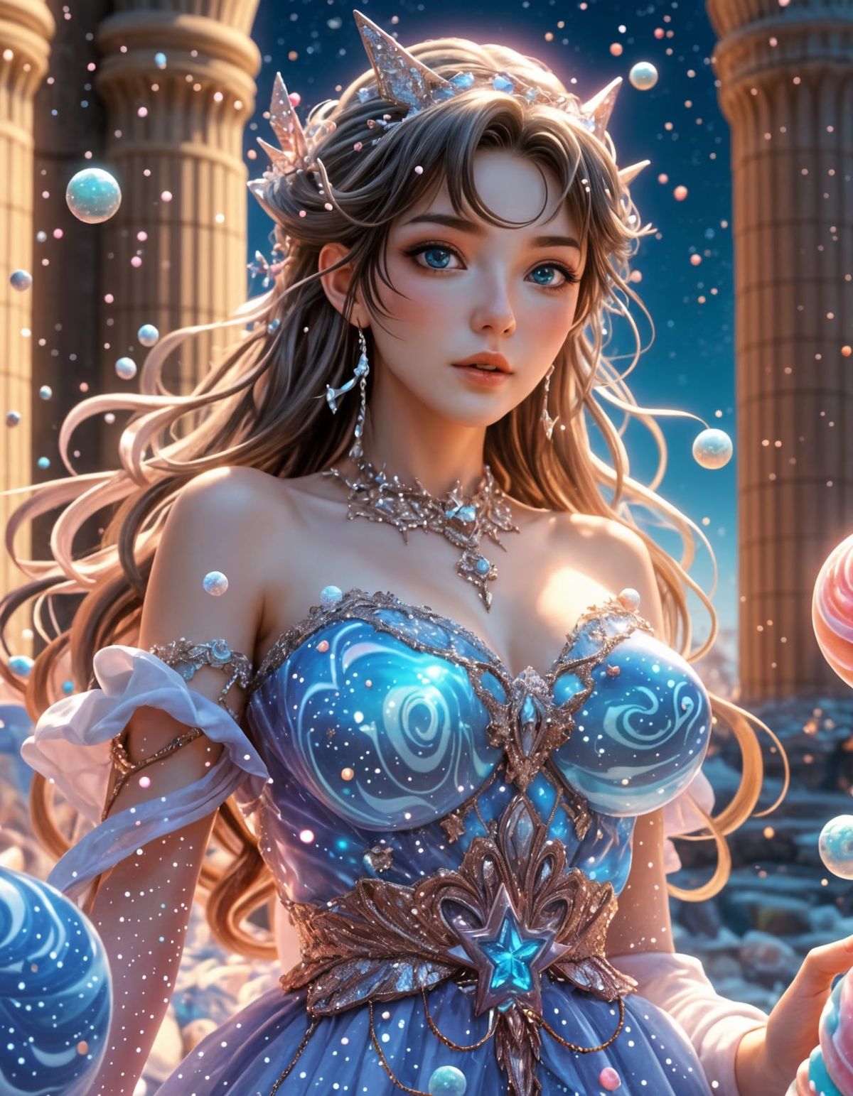 This image shows a cosmic sorceress in an anime 3D render style, creating a galaxy from fizzy cola and rock candy on a sugar landscape under a sherbet sky.